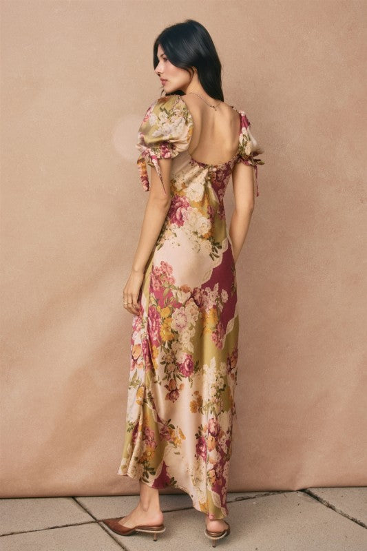Patchwork floral lace print satin midi/maxi dress with puff sleeves and bow tie details. Giving off a vintage look.