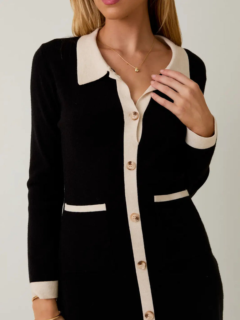 Chic and versatile, this 3/4 sleeve button-down knit dress features a flattering silhouette in classic black and cream. Perfect for effortless day-to-night style.