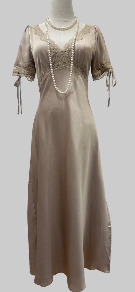 Indulge in effortless elegance with this champagne maxi dress, crafted from fluid satin that drapes beautifully with every step. Delicate lace detailing adds a soft, romantic touch, tracing the neckline and framing the bodice with intricate femininity. The champagne hue catches the light with a subtle sheen, giving the dress an understated yet luxurious glow.