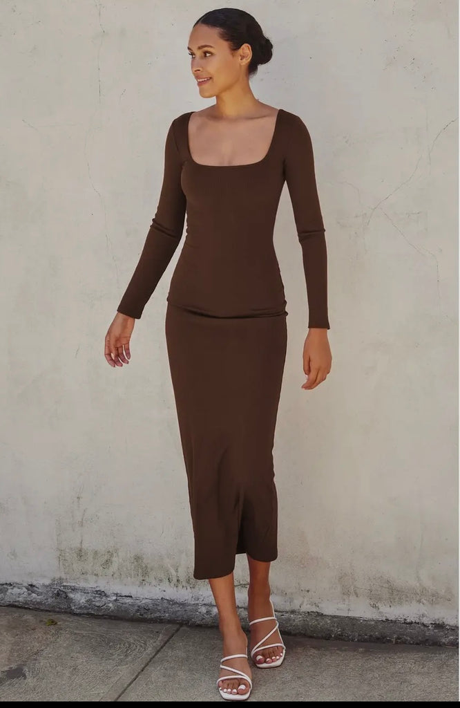 Embrace effortless sophistication in this long-sleeved, ribbed dress, crafted in a rich chocolate brown hue that flatters every skin tone. The soft, stretchy ribbed knit enhances your natural shape while offering all-day comfort, creating a sleek, contoured silhouette. A clean, square neckline adds a modern, structured touch, perfectly balancing the dress’s warm, cozy feel.