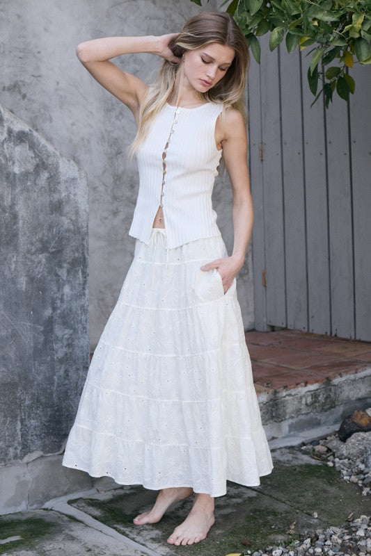 A chic and versatile sleeveless knit top featuring a flattering ribbed texture and front button detail. The soft viscose knit drapes beautifully, offering a lightweight and comfortable fit.